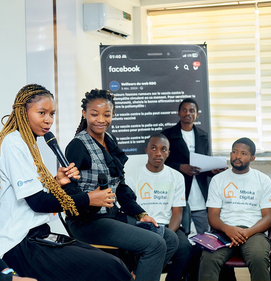 Depuis son lancement en 2022, Mboka Digital repose sur une stratégie participative ayant pour étaie une communauté active : les Veilleurs du Web. Ces jeunes, accompagnés par UNICEF et ses partenaires, sont formés à repérer et contrer les fausses informations en ligne, tout en co-créant des contenus pour les campagnes de santé publique (vaccination, santé mentale, lutte contre la violence en ligne, etc.).
